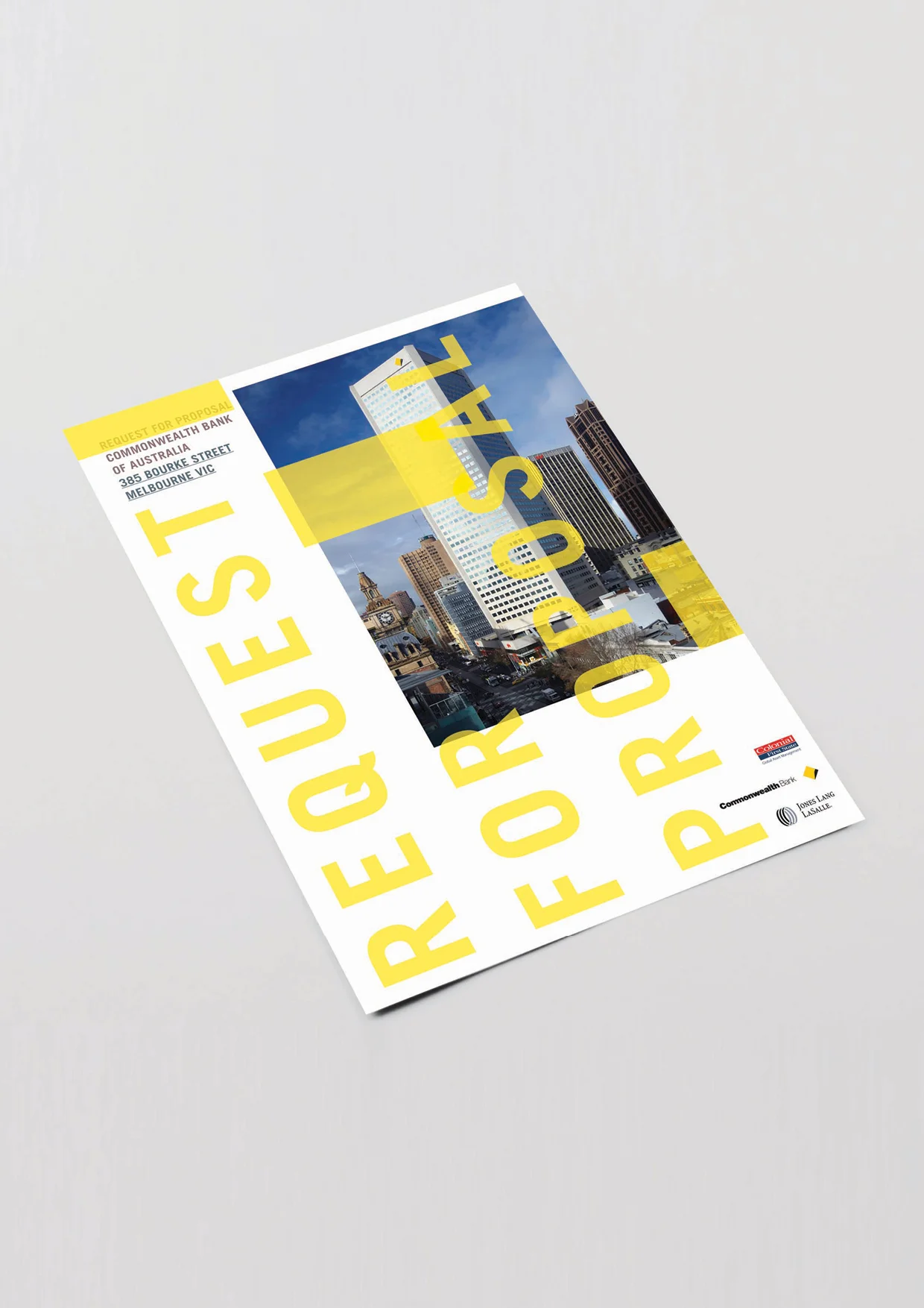 Concept for request for proposal for a new building in Collins Street, Melbourne. To make a text heavy document stand out a vibrant yellow was used throughout to create a bold and dynamic layout.